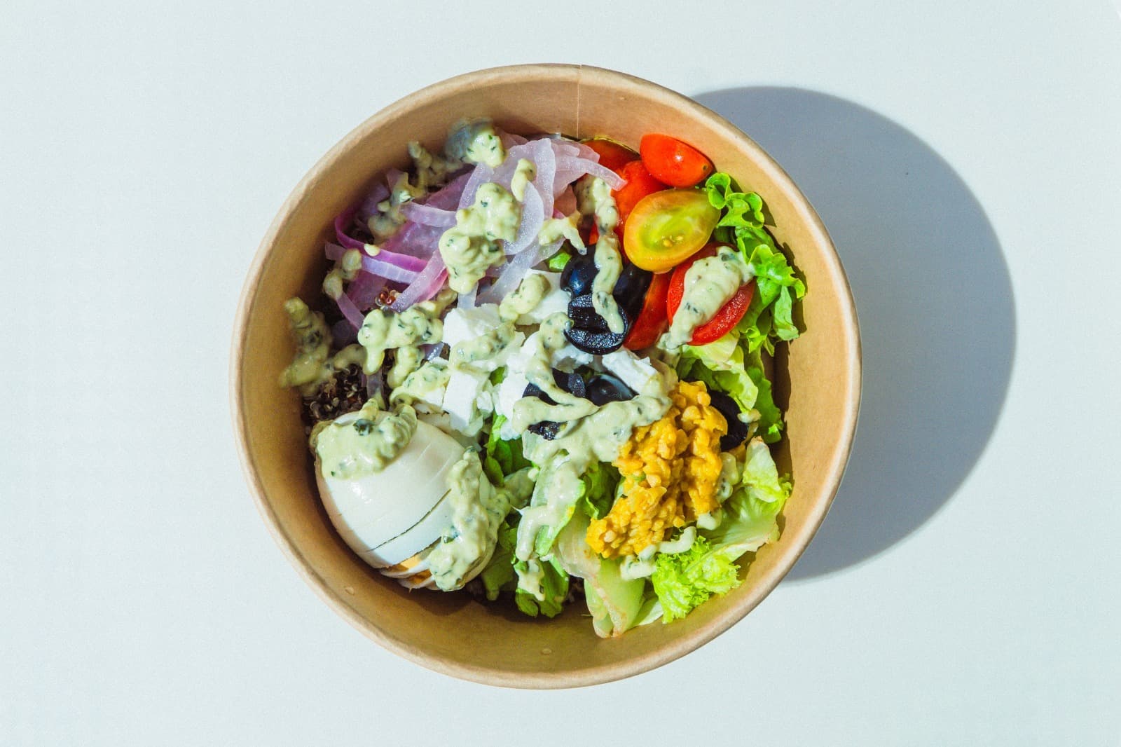 Mix de verdes, quinoa, hummus de garbanzos, huevo, queso feta, tomate cherry, aceitunas negras, cebolla avinagrada, salsa verde