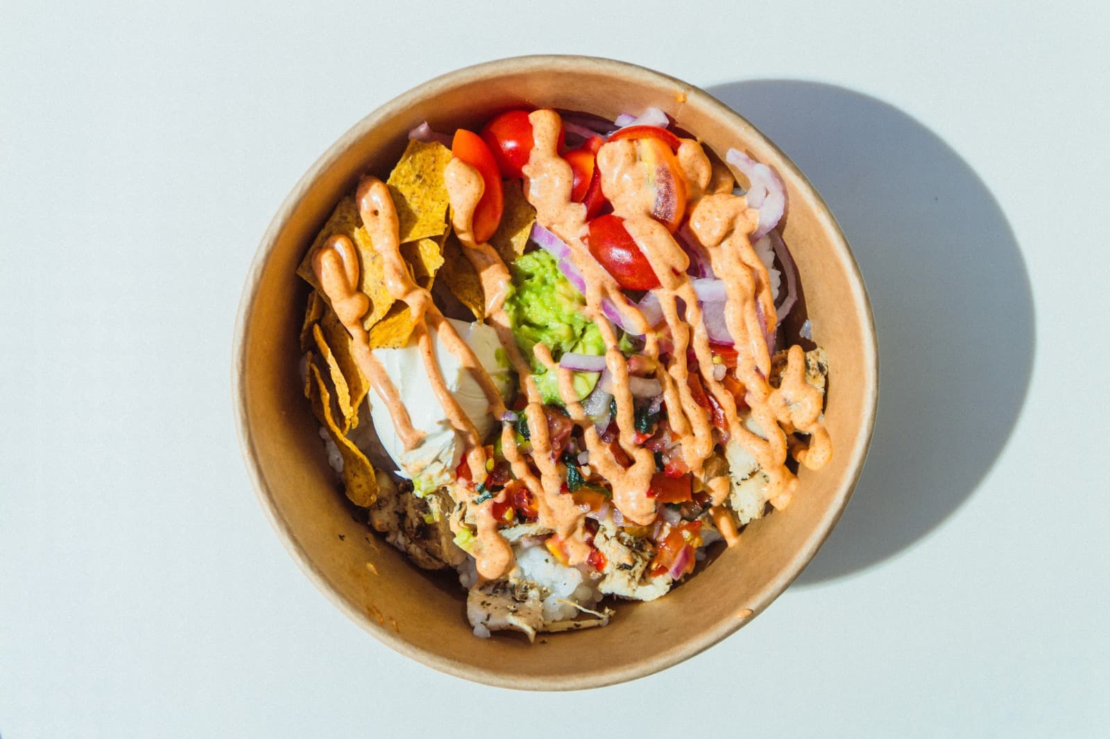 Arroz de sushi, nachos, palta, pollo a la plancha, pico de gallo, queso crema, salsa picante de la casa y tomates cherry